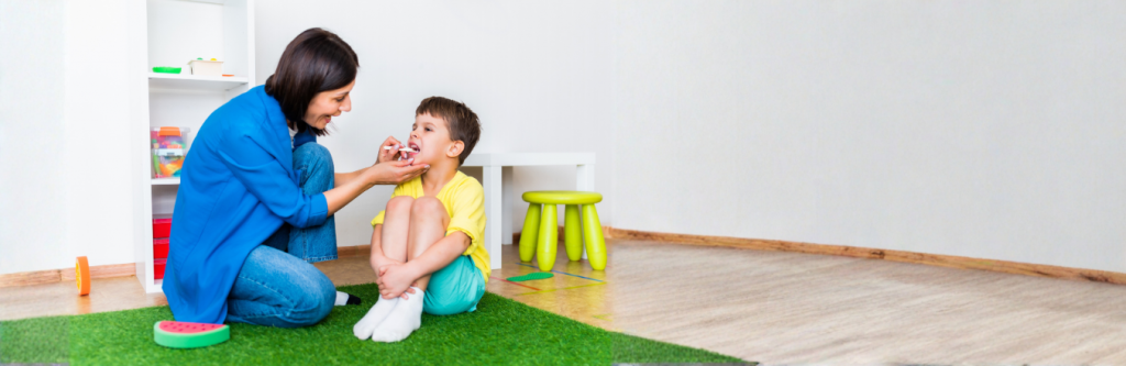 يُوجّه المعالج الطفل من خلال تمارين لتقوية المهارات الحركية الفموية، وتحسين المضغ والبلع، واستكشاف الأطعمة الحسية ضمن إطار منظم وداعم.