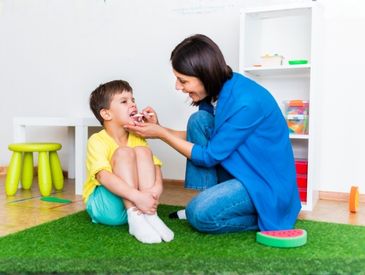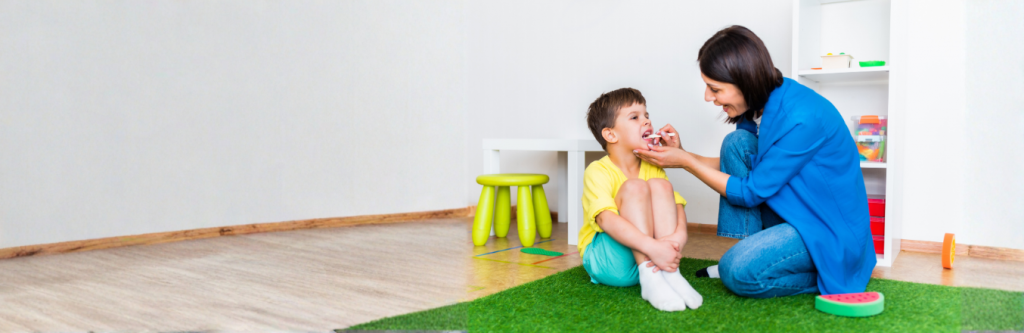 Therapists guide children through exercises for oral-motor strength, chewing, swallowing, and sensory exploration in a structured, supportive way.